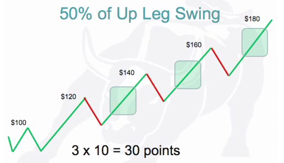 In the above swing trade the green lines going up are the long legs and red are short legs. In an uptrend you trade the long. Take only 50% of the long legs. Get in low and out a little bit higher. 50% in this case is 3 lots of 10 points so 30 points.