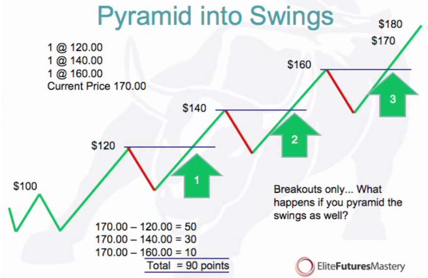 Now you can pyramid into a swing. You take the breakout trades where the blue lines are. Remember to put your stops at the bottom of each red line.
