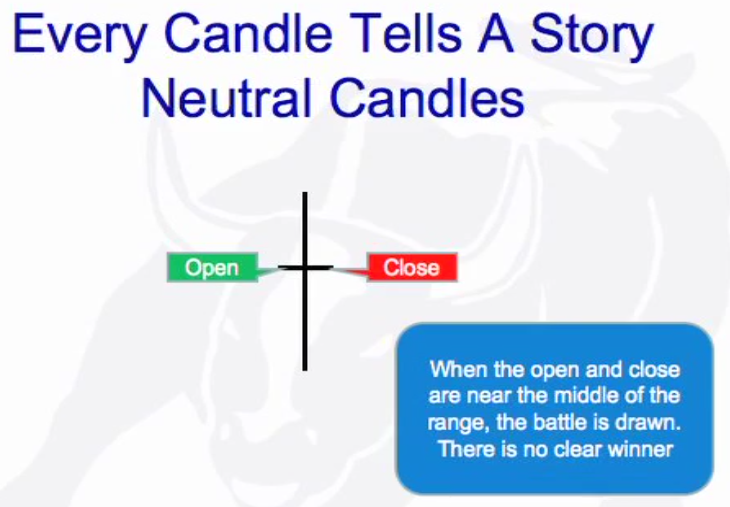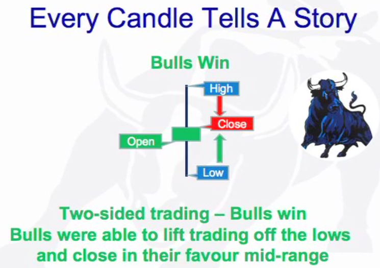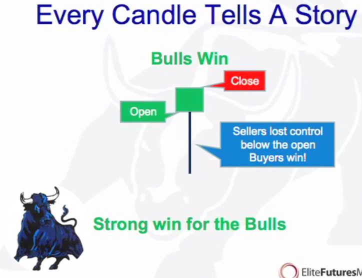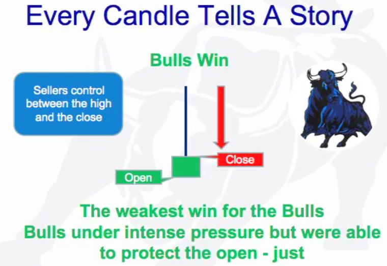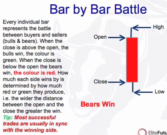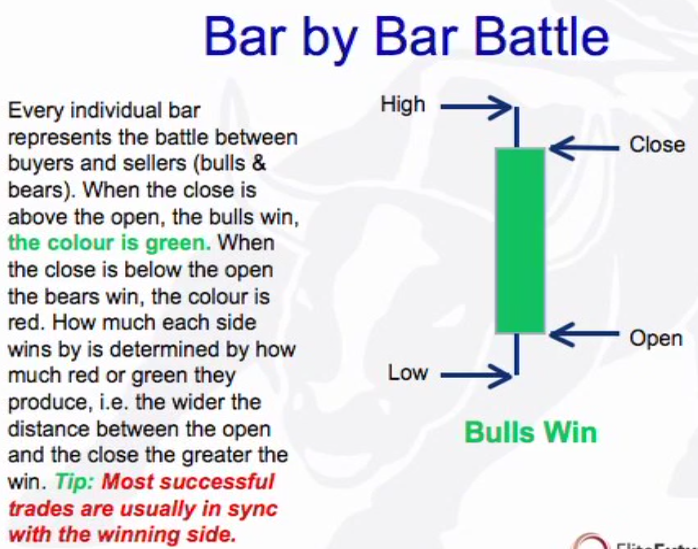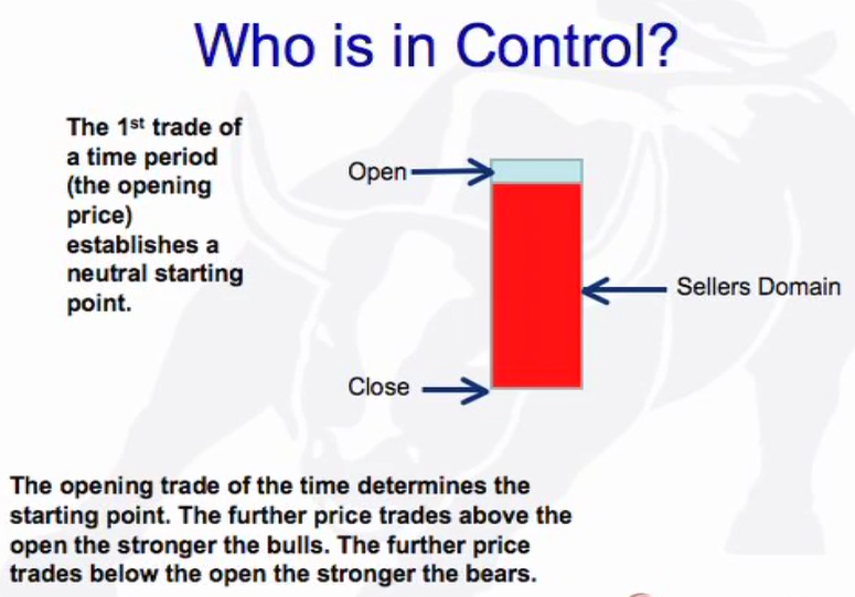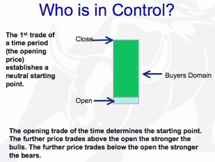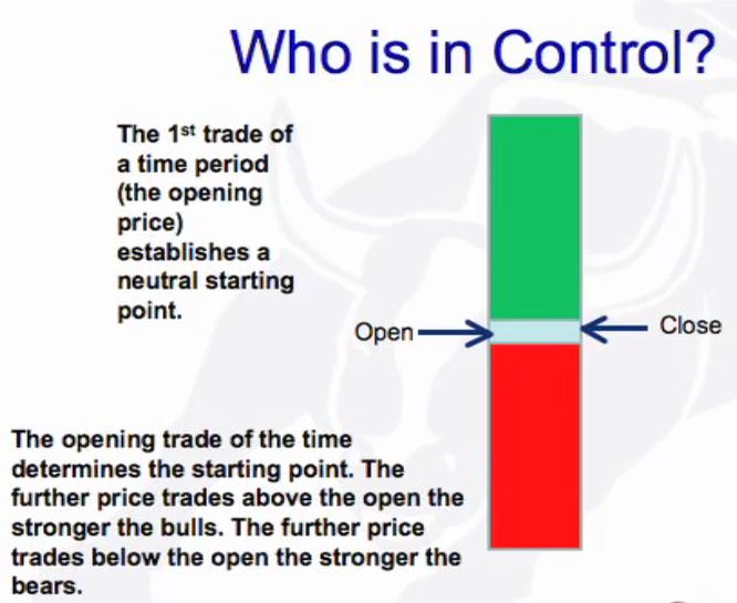 Open: Neutral starting point of every bar. All activity above the bar (green) is buyers domain and all activity below is sellers (red) domain. The further the price sells below the open the stronger the sellers (bear trend) and if above then stroner the buyers (bull trend). There is also the pig and the chicken.